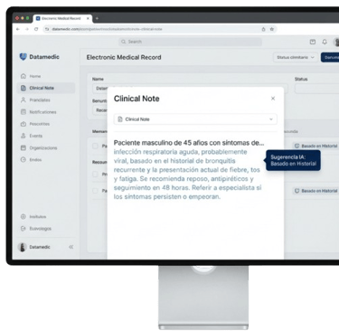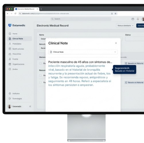 Generación Automatizada: Recetas, notas y resúmenes clínicos creados en segundos. El sistema aprende del contexto del paciente para sugerir diagnósticos y tratamientos.