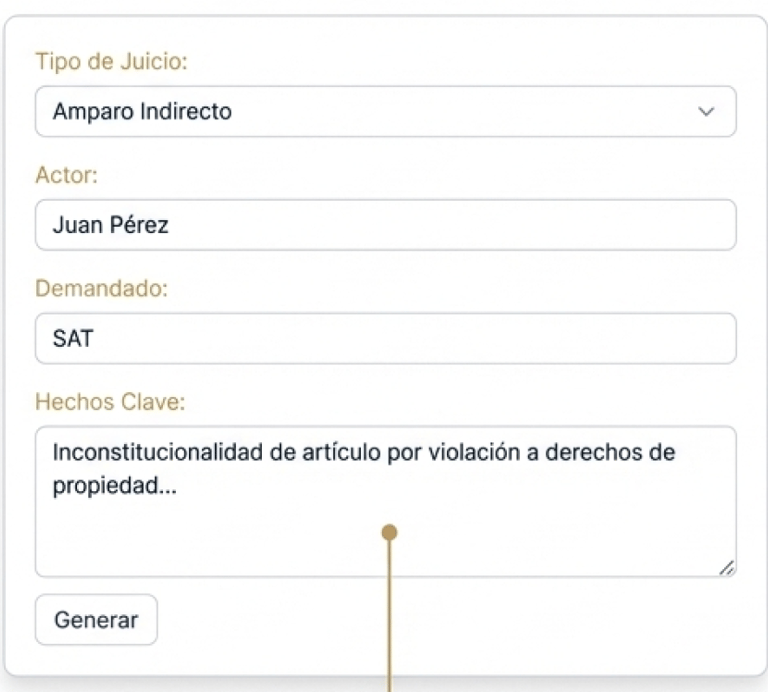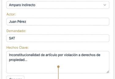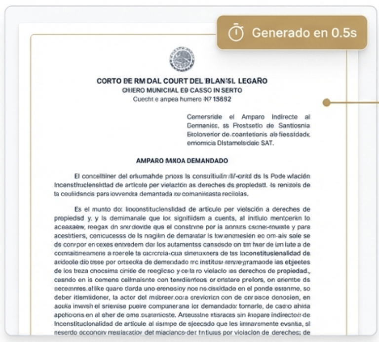 Generación Automática: Creación instantánea de borradores y machotes de alta calidad que solo requieren tu revisión final.